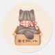 Fluffy grey cat sitting comfortably inside a cardboard box. The txt "If fits, sits" is expressing the cat's innate behavioral rule.