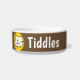 Fügen Sie dem lustigen Schüssel den Namen Ihres Haustieres hinzu, der eine Cartoon-Style-Abbildung eines Lächelns einer Katze enthält. Brauner Hintergrund.
