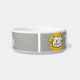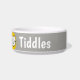 Fügen Sie dem lustigen Schüssel den Namen Ihres Haustieres hinzu, der eine Cartoon-Style-Abbildung eines Lächelns einer Katze enthält. Grauer Hintergrund.