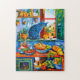 Eine blau-schwarze Katze blickt aus dem Küchenfenster in einem neugierigen, gemütlichen Ambiente. Malerei