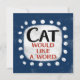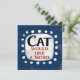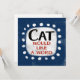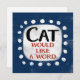 Ein unumkehrbares und niedliches typografisches Tierdesign, das "Katze will ein Wort" sagt. Er ist mit schwarzem und rotem Text auf einem weißen Rechteck mit funky, spielerisch weißen Punkten umgeben, die alle auf blauem Hintergrund dargestellt sind.
