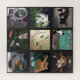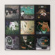 Eine Gruppe von Katzengemälden, die in einem Quiltmuster angeordnet sind. Neun Bilder von geilem Spaß. Farbenfrohe Bilder von Katzen und anderen Tieren, Fischschalen, Wein, Koi und mehr.