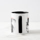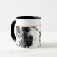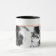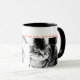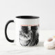 Eine weiße Tasse mit schwarzem Rand und Griff und ein Schwarz-Weiß-Foto einer wachsamen, halb-burmesischen Katze nah. In rot, direkt unter der Felge sind die Worte: "zuschauen, wie Sie mich beobachten..." Matching Mousepad und Tasche sind ebenfalls verfügbar.