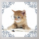 Kluge Tabby-Katze scheint ein Buch zu lesen. Katze hat eine Brille und Buch ist offen vor. An den Ecken des Drucks sind Bildrollen-Akzente in sanftem Blau erkennbar.