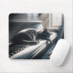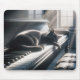 Eine dunkelgraue Katze schläft friedlich auf den Tasten eines großen Klaviers und strahlt sanft durch ein Fenster in der Nähe aus.
