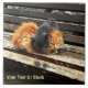 Zwei niedliche, junge Katzen, eine orange, eine schwarze; schauen auf die Welt durch schläfrige Augen, die gerade von einem Nickerchen erwacht sind, das auf einer Parkbank zusammengeschustert hat. Fügen Sie Ihren eigenen Text hinzu.
