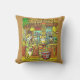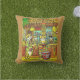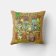 Throw pillow in a tropical-themed illustration depicting cats in a tiki bar. Dressed in vibrant Hawaiian shirts, one cat plays a ukulele and stands near a red drum, while others enjoy cocktails. The bar features bamboo decor, tiki masks, and palm fronds, for a festive, island atmosphere.