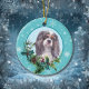 An der Vorderseite dieses Holiday-Ornament ist ein schönes Porträt eines dreistöckigen Cavalier King Charles Spaniel Hundes gerahmt in einem heiligen und immergrünen Husten. Rote Beeren und Kiefernkonen schmücken die heiligen und kiefernroten Früchte. Das Bild wird auf einem blass blauen Kreis gerahmt durch ein Retro-blaues Schneeflockenmuster platziert. Die Rückseite des Ornaments hat den gleichen Hintergrund und Kreis mit Ihrem benutzerdefinierten Text in blau.