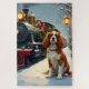 A nostalgic and heartwarming Christmas painting of a Cavalier King Charles Spaniel waiting at a snowy train station. Perfect for those who love vintage holiday charm and timeless festive art.