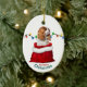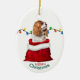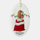 Auf der Vorderseite dieses Holiday-Ornament ist ein Bild von einem bezaubernden braunen und weißen Cavalier König Charles Spaniel in einem rot-weißen Weihnachtsgeschenk Tasche. Hinter dem Hund befindet sich eine Reihe farbenfroher Urlaubslichter. Im Text unten steht "Frohe Weihnachten". Die Rückseite des Ornaments hat das gleiche Bild mit einem individuelle Name-Feld.