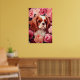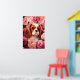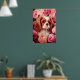 Ein nahes Portrait eines blenheim Cavalier King Charles Spaniel Welpen, in einem malerischen Stil dargestellt. Der Hund hat einen weißen und braunen Mantel mit großen, ausdrucksstarken braunen Augen. Es ist von einer Fülle von rosa und pfirsichfarbenen Rose umgeben, die eine sanfte und romantische Atmosphäre schaffen. Das Fell des Hundes wird mit sorgfältiger Detaildarstellung dargestellt, die die Textur und den Fluss seiner langen, seidigen Haare einfängt. Perfektes Geschenk für Cavie Liebhaber.