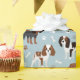 Niedlicher Cavalier King Charles Spaniel mit schwarzen, braunen und weißen Mänteln mit verstreuten Hundeknochen und Pappmustern.