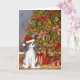 Diese Weihnachtskarte zeigt ein Aquarellbild eines tri gefärbten Cavalier King Charles Spaniel Hundes mit einer Weihnachtsmannmütze, die unter einem Weihnachtsbaum sitzt.