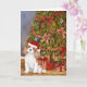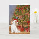 Diese Weihnachtskarte zeigt ein Aquarellbild eines Cavalier King Charles Spaniel Hundes mit einer Weihnachtsmannmütze, die unter einem Weihnachtsbaum sitzt.