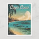 Eine lebendige und nostalgische Darstellung von Cayo Coco, Kuba, einem tropischen Paradies, das für seine unberührten weißen Sandstrände, das türkisfarbene Wasser und die üppigen Mangroven bekannt ist. Das Design spiegelt die idyllische Schönheit der Insel mit ihren abgelegenen Küsten, Luxusresorts und dem kristallklaren Karibischen Meer wider. Das Vintage Kunstwerk erinnert an die entspannende Atmosphäre und die natürliche Pracht von Cayo Coco und lädt die Besucher ein, seine ruhigen Strände, die vielfältige Tierwelt und das lebendige Meeresleben zu erkunden.