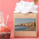 Rechteckiger Aufkleber mit der typischen Architektur der alten Häuser, die am Strand des Mittelmeers in Cefalu auf der Insel Sizilien in Italien errichtet wurden.