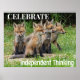 Vier rote Fuchskits werden abgebildet, drei davon mit einem Blick auf etwas und der vierte starrt direkt auf den Betrachter.