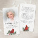This elegant memorial prayer card is designed to celebrate a life well lived, featuring a softly faded photo, graceful script typography and a symbolic red cardinal resting on evergreen branches. Often associated with comfort and enduring connection, the cardinal adds heartfelt meaning to the design. The back includes a reflective message of remembrance and hope, making this card a meaningful keepsake to share at a funeral, memorial service or Celebration of Life with family and friends. Its small and portable size of 3.5x2" (wallet-sized) makes it convenient for loved ones to carry it with them as a reminder of your loved one’s life and spirit. Personalization makes each card unique.