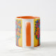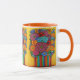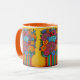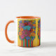 Lebhaftes stilisiertes Gemälde eines bunten Blumenstraukets in einer farbenfrohen gestreiften Vase der beliebten Künstlerin Lisa Lorenz auf einer stilvollen Tasse.