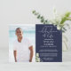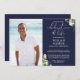 Elegant navy blue, modern garden greenery, funeral celebration of life remembrance photo invitation. Designed by Thisisnotme©