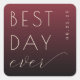 This wedding sticker features a modern, minimalist design with a gradient background transitioning from deep maroon to black. The phrase "BEST DAY ever" is prominently displayed in bold, uppercase sans-serif letters paired with an elegant cursive script for the word "ever," creating a striking contrast against the dark backdrop. The warm color palette and clean typography convey a celebratory and optimistic mood, making it perfect for commemorating your special day. Its simple yet impactful aesthetic ensures it will stand out as a memorable keepsake.