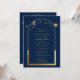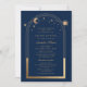 Celestial Blue Gold QR Code Quinceañera Einladungen bietet eine elegante goldene Sonne, Mond und Sterne mit einem goldenen Rahmen auf einem blauen Hintergrund. Innen ist Ihre individuelle Quinceañera Einladung Informationen. Auf der Rückseite fügen Sie zusätzliche Informationen wie Ihre Quinceañera Website und QR-Code. Personalisieren Sie den Text in den Textfeldern, indem Sie ihn bearbeiten. Für Sie entworfen von Evco Studio www.zazzle.com/store/evcostudio