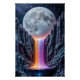 Ein visionäres Hochauflösendes Kunstwerk in der Keramik, das eine ätherische Alien-Nightscape darstellt. Ein kolossaler Mond mit opaleszenten, perlmuttfarbenen und subtilen Glasien dominiert ein tiefes Indigo und ein lila Himmel, der von kristallinen Sternen-ähnlichen Details übersät wird. Unter dem Mond strömt ein strahlender Wasserfall aus geschmolzenen Regenbogenglasuren - Rosa, Gelb, Zyane und Purpel - die sich zwischen zerklüfteten, kristallinen Klippen kaskadieren, die in tiefen Tealen, Blues und Amethysten verglast sind. Der Lichtstrom sammelt sich in einem reflektierenden, obsidian-schwarzen Becken und spiegelt sowohl himmlisches als auch lebendiges Licht wider. Das Stück verbindet fantastische Geologie und futuristische Eleganz, zeigt meisterhafte Glasur-Kontrolle und skulpturale Details, die Mysterium, Gelassenheit und Ehrfurcht hervorrufen.