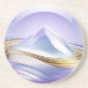 Ein etherisches digitales Kunstwerk, das eine leuchtende, lichtdurchlässige oder orbfarbene, glatte, pastellfarbene Bergkulisse zeigt, die von eleganten goldenen Ringen umgeben ist. Die traumhaften lila und blauen Farbtöne, zusammen mit funkelnden sternähnlichen Akzenten, schaffen ein kosmisches Ambiente, das sich auch in anderen Welten widerspiegelt. Dieses futuristische Design erinnert an das Gefühl, eine ganze Miniaturgalaxie oder Alien-Landschaft in einer gläsernen Kugel zu halten.