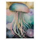 Dieses Kunstwerk besticht durch eine faszinierende Qualle. Die Glocke wird in einem sanften Spektrum an Pastellpinken, Blues und Pfefferminzen mit zarten, leuchtenden Striationen gerendert. Seine langen, fließenden Tentakel verlaufen in einer Kaskade ähnlicher Farben nach unten und schaffen ein Gefühl von anmutiger, welliger Bewegung. Der Hintergrund ist ein traumhafter, abstrakter Raum voller schwebender, orbähnlicher Formen in mutierten Goldtönen, Lavendel und Rosa, was auf eine mystische Unterwasserwelt oder sogar kosmische Umgebung hindeutet. Das Stück verbindet ein Gefühl des biologischen Realismus mit einer surrealen, ätherischen Atmosphäre, die das Wunder und das Geheimnis des Lebens in der Tiefsee weckt.