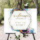 Elegantes Hochzeitswillkommenszeichen mit exquisiten Aquarellfärbungen in kosmischen Galaxietönen, mit tanzenden Sternen, die hinter goldenen geometrischen Sechsecken mit Begrüßungsbotschaften mit Paarnamen kaskadieren. Aquarellfarbene Flecken in einer Mischung aus Blau, Marine, aquamarin, Türkis, lila, Fuchsia und goldenen Farbtönen. Moderne handgeschriebene Kalligrafiedetails. Erhältlich in 30" x 24" Mittelgröße und viele andere kleinere Größen zur Auswahl. Leicht zu rahmen oder alternativ kleben/stapeln zu stabil günstigen MDF. Teil unserer Kollektion "Mystic Garden Celestial" mit einer Vielzahl von Produkten zur Koordination. Abmessungen des Zeichens im Demo-Foto mit Stand: 24" x 18"