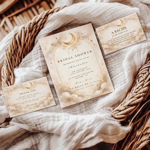 A dreamy celestial design featuring a glowing golden crescent moon set within an elegant arched frame. Soft luminous clouds, delicate stardust sparkles, and warm champagne tones create a romantic, ethereal atmosphere. The subtle marble-like background and refined gold detailing add depth and sophistication while maintaining a soft, airy glow. Perfect for a modern bride who loves celestial magic with an elevated, timeless aesthetic.