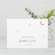 Eine minimalistische, moderne himmlische Hochzeitseinladung zeichnet sich durch ein schlichtes und elegantes Design aus. Es beinhaltet einen vergoldeten Mondfilm und Sterne, die sanft glitzern, Set vor einem sauberen Hintergrund. Die Einladung benutzt klassische Serifentypografie, die eine traditionelle und formale Touch mit ihrem gepflegten und klaren Stil hinzufügt.