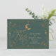 Celestial gold moon, frame, and stars on a green background. Beautifully save the date that can be customized with your name. Select the "customize" button to change the font style, color, and size.