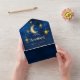 Dieses wunderschöne Aquarelldesign besticht durch einen glühenden Halbmond mit Sternen und Planeten auf einem blauen Himmelshintergrund Mitternacht. Die Rückseite der Karte hat den gleichen Hintergrund am Nachthimmel um Mitternacht, der durch einen großen glühenden Halbmond gekennzeichnet ist. Diese schöne Einladung ist Teil einer passenden Hochzeitssuite, die personalisiert sein kann.