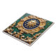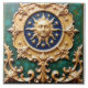 Goldene Sonne mit menschlichem Set in einem runden goldenen Rahmen von Sternen, verzierte goldene Dekoration, dunkelblauer Kreis, grüner Marmorhintergrund.