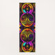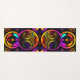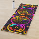 Balanced and harmonious, this design for a yoga mat features neon colors on a black background, with two circles. The larger circles has a feathery pattern, and the smaller circle has little circles and half circles. Beautiful, colorful, very Zen-like.