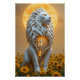 Erleben Sie einen majestätischen, stilisierten, weißen Löwen, der in einem aufwändigen, layered Papercraft oder Skulpturenstil gefertigt wurde und stolz inmitten eines lebendigen Feldes großer gelber Sonnenblumen stehend ist. Sein fließender Mann wirbelt dynamisch, fängt Bewegung und Power ein, während die gelben oder orangefarbenen Augen durchdringen, die Intensität und Kraft vermitteln. Der Rumpf des Löwen, oder ein bedeutender Teil seines Körpers, wird dramatisch geknackt oder aufgespalten, was ein atemberaubendes inneres Stadtbild offenbart - eine glänzende, futuristische Metropole aus hohen Wolkenkratzern, komplexen geometrischen Strukturen und leuchtenden Lichtwegen, die an den Kern eines Planeten erinnern, der durch eine Himmelsfraktur freigelegt wurde. Hinter dem Löwen dominiert eine leuchtend orangefarbene Sonne oder eine abstrakte Himmelsscheibe, die sich allmählich in eine sternenkosmische Weite an den oberen Rändern verwandelt und so die mystische und andere Welten-Atmosphäre verstärkt. Die Gesamtästhetik verbindet auf meisterliche Weise Bio, spirituellen Naturalismus - verkörpert im Löwen- und Sonnenblumenfeld - mit schlankem High-Tech-Futurismus, der in der strahlenden Stadt im Löwen gezeigt wird. Diese höchst detaillierte und symbolische Szene schafft einen auffallenden Kontrast zwischen dem warmen, natürlichen Äußeren und dem coolen, leuchtenden Innern, der die Themen innere Stärke, Entdeckung und kosmisches Staunen hervorruft.