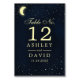Celestial Moon Stars Midnight Blue Wedding Tischnummer. Dieses Design zeichnet sich durch funkelnde Sternlichter aus, die mit einem leuchtenden Halbmond im Sternenhimmel aufwarten.