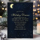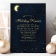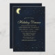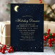 Celestial Moon Stars Mitternacht Blue Holiday Dinner Einladung. Dieses Design zeichnet sich durch funkelnde Sternlichter aus, die mit einem leuchtenden Halbmond im Sternenhimmel aufwarten.