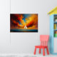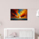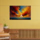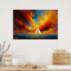 A lone sailboat glides across a tranquil sea, its white sails illuminated by the fiery breath of a swirling sky. Reds, oranges, and golds collide with deep blues and purples, creating a celestial storm of color and emotion. Above, a flock of birds cuts through the chaos, hinting at movement, freedom, and unseen destinations.