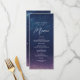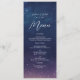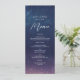 Set Sie mit dieser eleganten himmlischen Hochzeitskarte für ein zauberhaftes Abendessen. Dieses Menü mit einem traumhaften marinen und violetten Sternenhimmel am Nachthimmel zeigt Ihre Vorspeisen, Vorspeisen und Nachspeisen in einem romantischen und stilvollen Ambiente. Ideal für Hochzeiten mit Sternen, Kosmischen und Nachttischlampen. Dieses Design verleiht Ihren Empfängen eine Touch des Staunens. Sie können den Text ganz nach Ihren Wünschen anpassen.