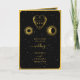 Ein mystisches himmlisches monogramm Hochzeitsdesign in Schwarz und Gold. Ein einfaches Design im Stil eines Tarots, das einen Himmelsstars-Hintergrund mit einem goldenen Halbmond, Himmelssonne und passender Herzmonogramm verwendet. Ein elegantes, schwarz-goldenes Himmelsdesign mit klassischer Schrift-Typografie. Modernes Tarot-Thema Hochzeit Ordnung Service Design mit modernen Elementen. Auch die passenden Hochzeitseinladungen und andere Schreibwaren sind verfügbar.