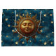Amid a starry celestial background, the serene face of a stylized golden sun.