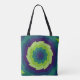 Dieses Bild ist ein lebendiges, digital geschaffenes Spiralkaleidoskopmuster, bestehend aus ineinander greifenden, zerklüfteten Ringen in den Farbtönen grün, blau und dunkel indigo. Das Design strahlt von der Mitte nach außen aus und schafft eine faszinierende optische Täuschung, die an einen wirbelnden Wirbeln oder an eine stilisierte Blumenmandala erinnert. Das Zusammenspiel kontrastierender Farben und scharfer, sich wiederholender Formen erzeugt ein Gefühl von Tiefe und Bewegung, das das Auge des Betrachters erfasst