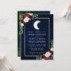 Einladung zur Hochzeit am Himmel. Wasserfarbener Nachthimmel mit Sternen und dem Mond. Burgundy Blue Pink Floral. Eukalyptus-Blätter im Grünen. Goldrahmen. Foto zurück.