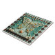 A white butterfly with orange details on a turquoise background with stars, moons and flowers , diamond pattern border in brown and turquoise.