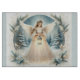 A serene celestial angel stands beneath a snowy archway of evergreens and winter florals, gently cradling a glowing lantern that spills soft golden light across her gown. Behind her, a dusky blue forest of snow-covered trees shimmers with falling flakes and tiny sparks of light, creating a peaceful, storybook atmosphere. Delicate lace details, flowing sleeves, and a halo-like crown of foliage give this winter angel illustration an ethereal, cottagecore charm that feels both nostalgic and on-trend. Soft blue and warm cream tones blend into a dreamy palette that suits spiritual holiday imagery, quiet reflection, and year-round messages of hope. This design is ideal anywhere a touch of calm, light, and heavenly beauty is desired. AI generated artwork.