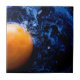 The orange sphere floats like a sun above deep blue textures, merging the ordinary with the infinite.