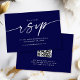Die Celine Wedding Website RSVP Card ist ein modernes, schlankes Design, das es Ihren Gästen leicht macht, mit der Celine Wedding Website UAWG zu machen. Die Vorderseite der Karte lädt die Gäste ein, über Ihre Hochzeitswebsite zu antworten, während auf der Rückseite ein benutzerfreundlicher QR-Code steht, der direkt zu Ihrer Online-UAWG führt. Das elegante, minimalistische Design in dunkelblau (nächtliche Tiefen aus der Hochzeitsfarbenpalette) passt perfekt zum himmlischen Thema der Celine Wedding Suite. Es sorgt für stilvolle und funktionelle Schreibweise. Ideal für Paare, die ihre RSVPs mit einer digitalen Option vereinfachen möchten, behalte diese Karte Ihre Hochzeitsplanung stressfrei.