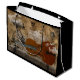 Ein schönes altes Cello ist der Schwerpunkt im surrealen Szenario auf dieser elegant evokativen Geschenktasche, die ein Schwerkraft-herausforderndes antikes Taschenuhr-, Bach Musikmanuskript und die unwahrscheinlichen Flugmaschinen, die durch die Wolken gleiten darstellt, unter anderen unerwarteten Elementen.